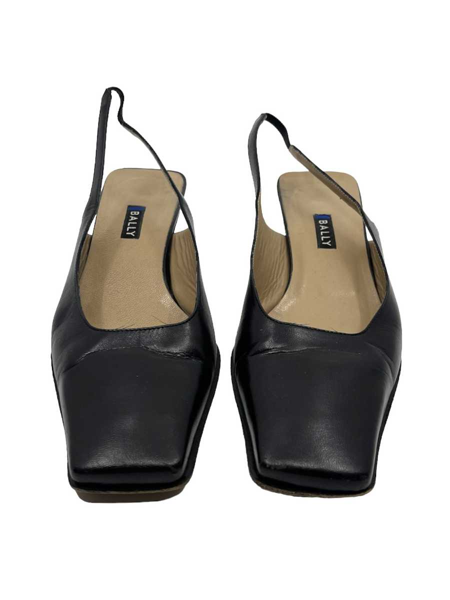 Bally slip in pumps with fine strap at the heel and square toe. The shoe is made of blue calf nappa leather, has gold buckles for closure and a block heel.