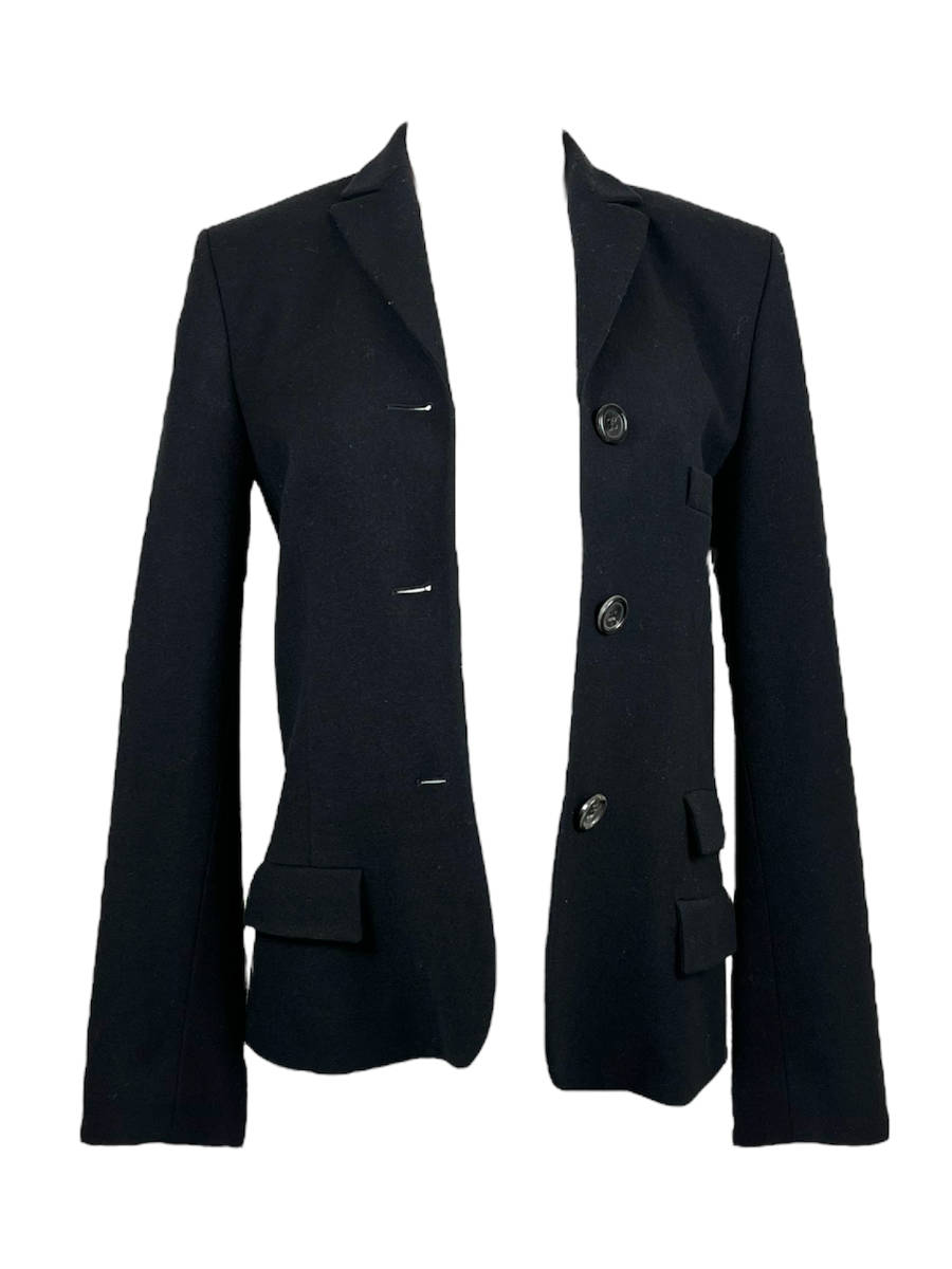 Jil Sander blazer in navy from the 90s with three outer pockets. The blazer closes with three buttons at the front and it has a fine shoulder pad.