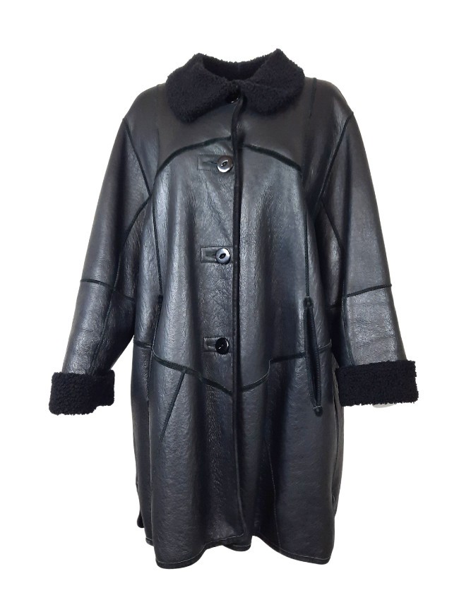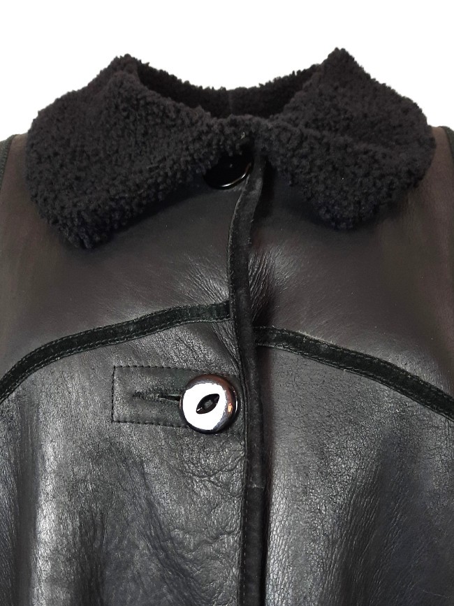 Patchwork optical coat from Marester Italy in black. Made of leather and curly lambskin. Small side seam slits and side welt pocket.