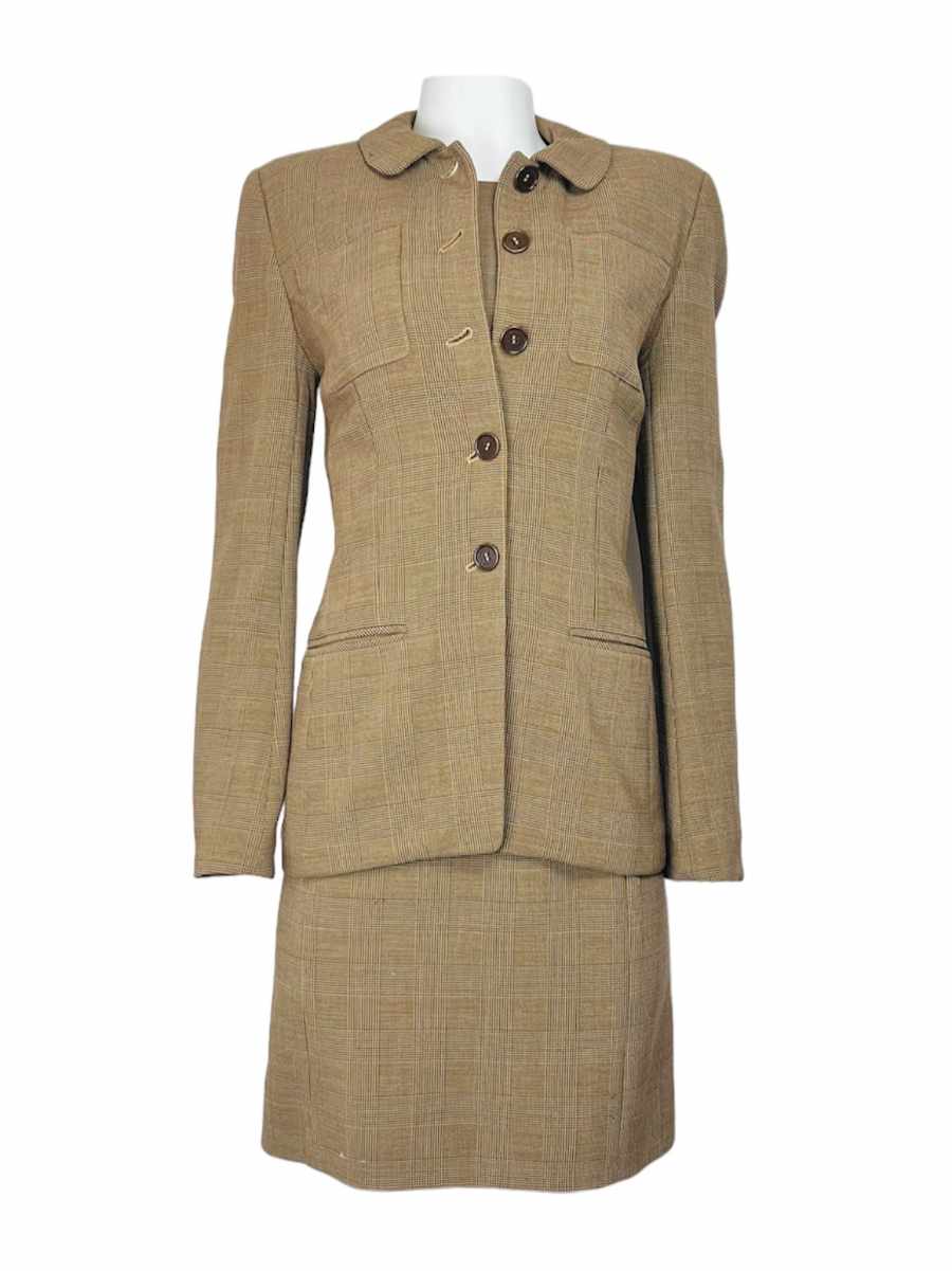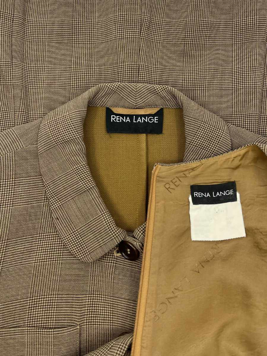 Rena Lange ensemble of dress and blazer. The two-piece is made from a classic wool fabric with a gelncheck pattern in brown. Each piece by Rena Lange is made with elegance and sophistication. The brand was founded in 1916 as a lingerie brand and evolved in the 1960s into the couture fashion brand it is known as today.