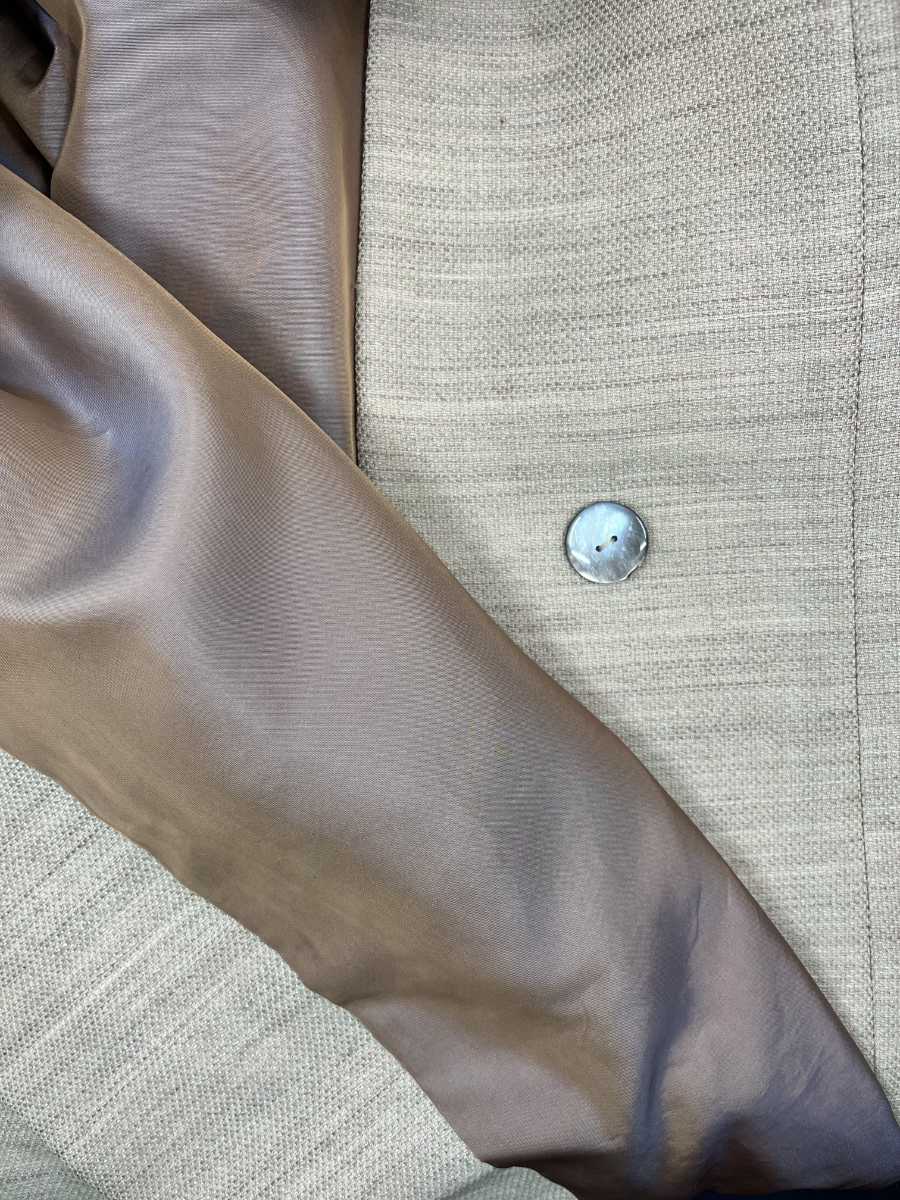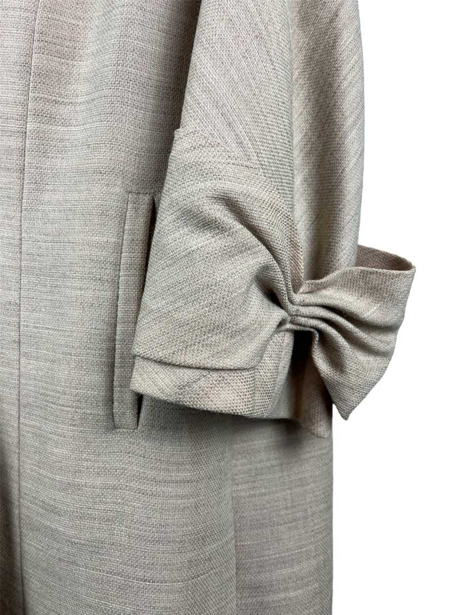 The ruffled sleeve makes this otherwise simple 1953 summer coat an interesting vintage couture piece. The side welt pockets are a practical detail and the hidden button closure serves its purpose while also looking very aesthetically pleasing.