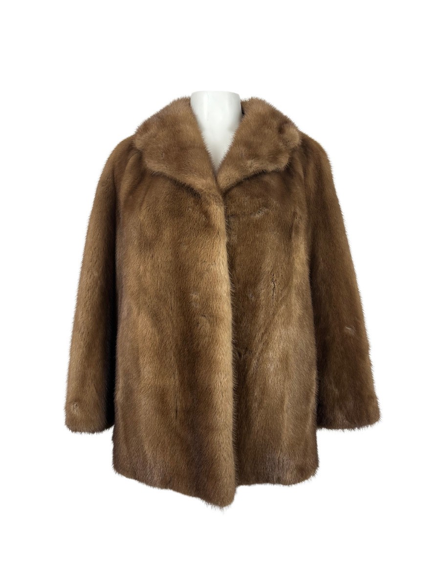 Mink jacket from 1965 in the colour caramel from Basel. The A-line jacket with a lapel collar and a raglan sleeve has two hidden pockets on the front and a small hidden inside pocket in the lining on the front edge.