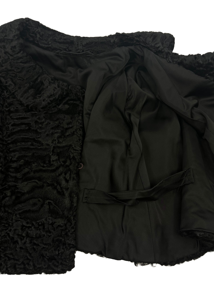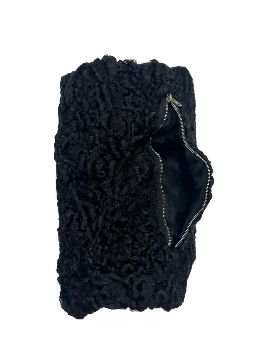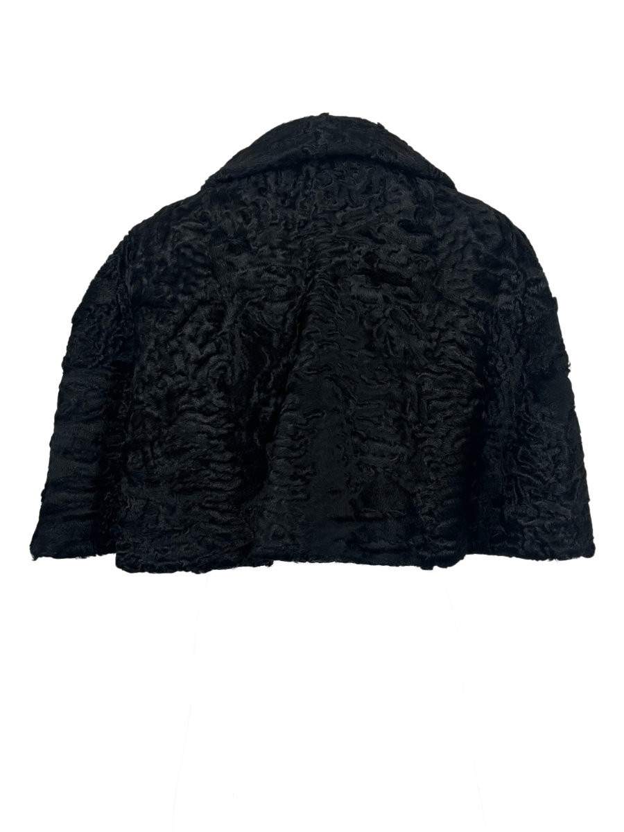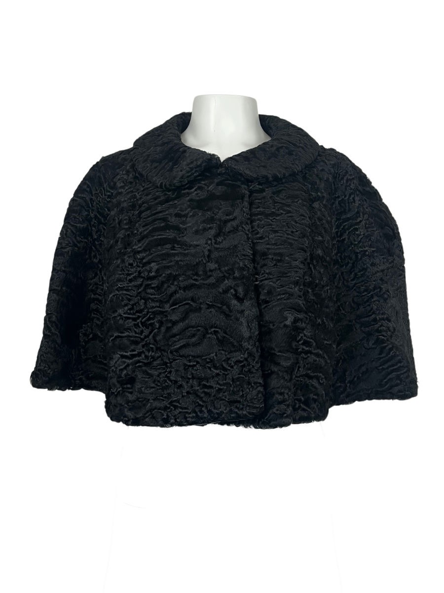 The Persian cape from the 1950s with matching muff in black has loops for the arms. The muff also has a loop that can be worn on the arm when the hands are needed. The muff also has a small zipped pocket on the inside. Everything is lined with a silk satin.