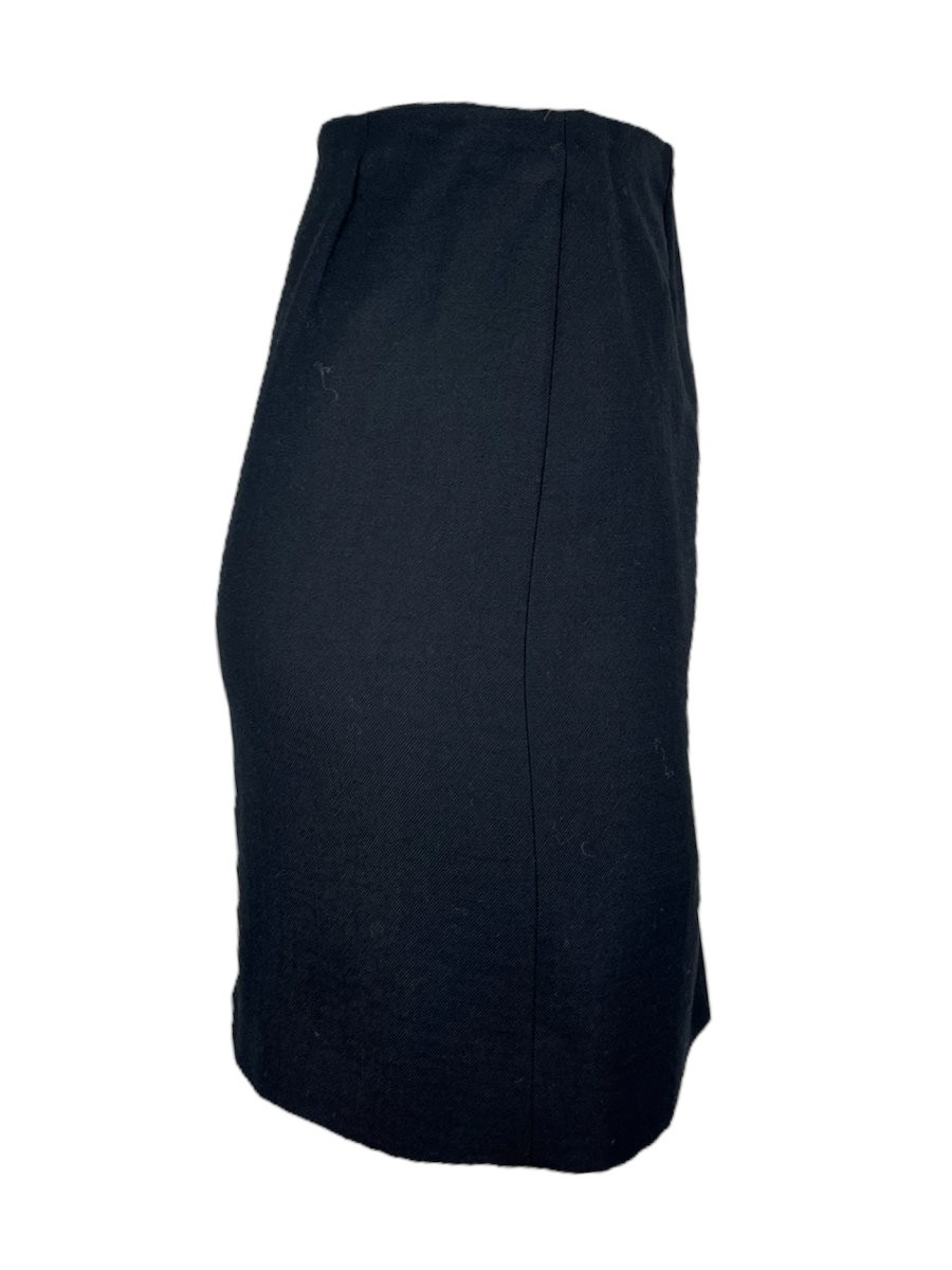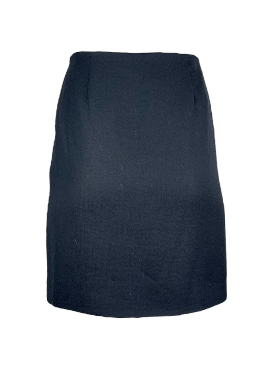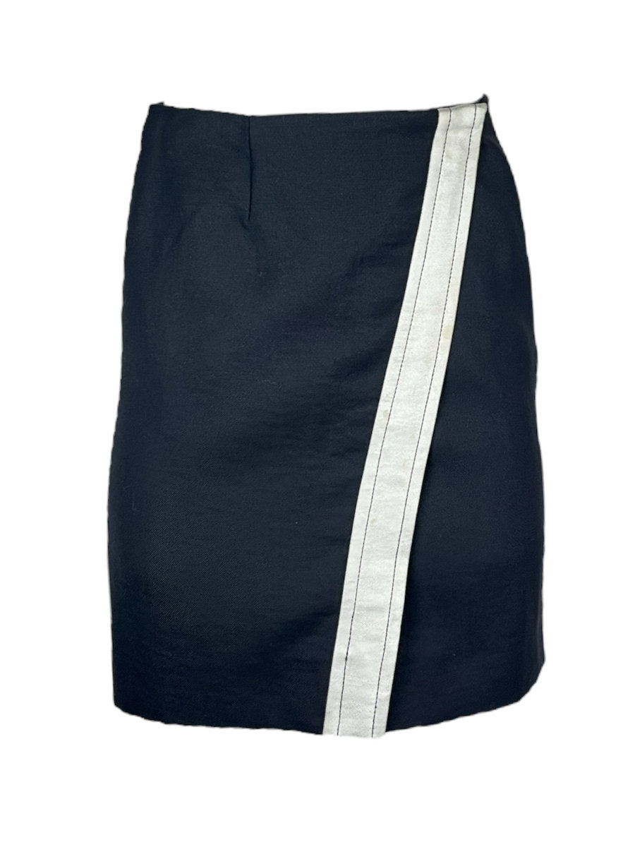Rosmarie Amacher Wickeljupe aus den 90er Jahren. Der Jupe aus Wolldoubleface in schwarz und creme verfügt über ein schräges Detail vorne und ist ansonsten sehr schlicht.
