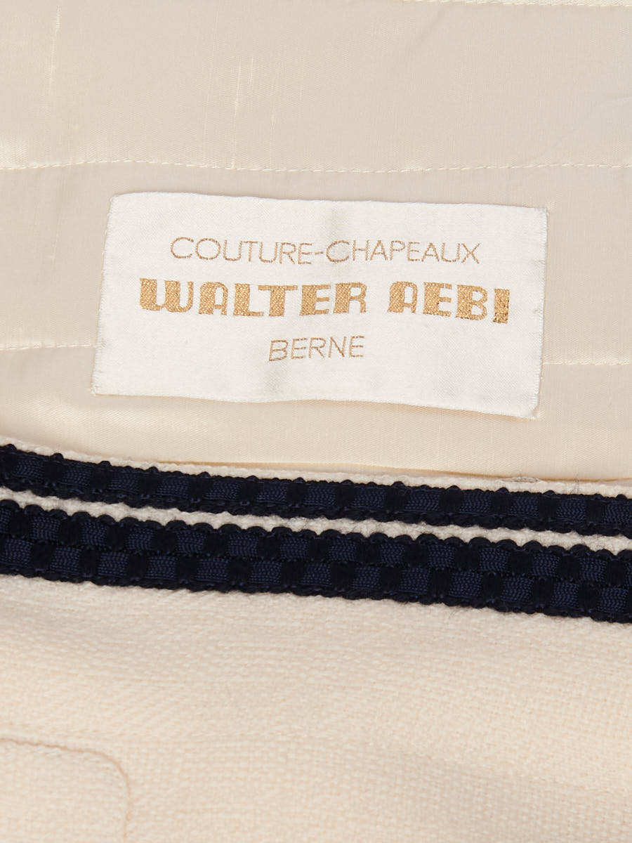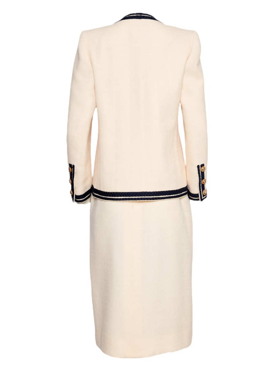 Chanel Woll-Costume écru mit Possamenten Borduren in blau. Made by Couture Chapeaux Walter Aebi Berni Couture. Das Costume ist mit einem Pongé Futter gefüttert. Die Knöpfe am Ärmel sind Atrappe.