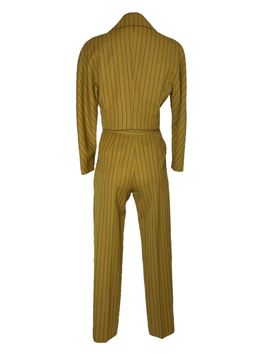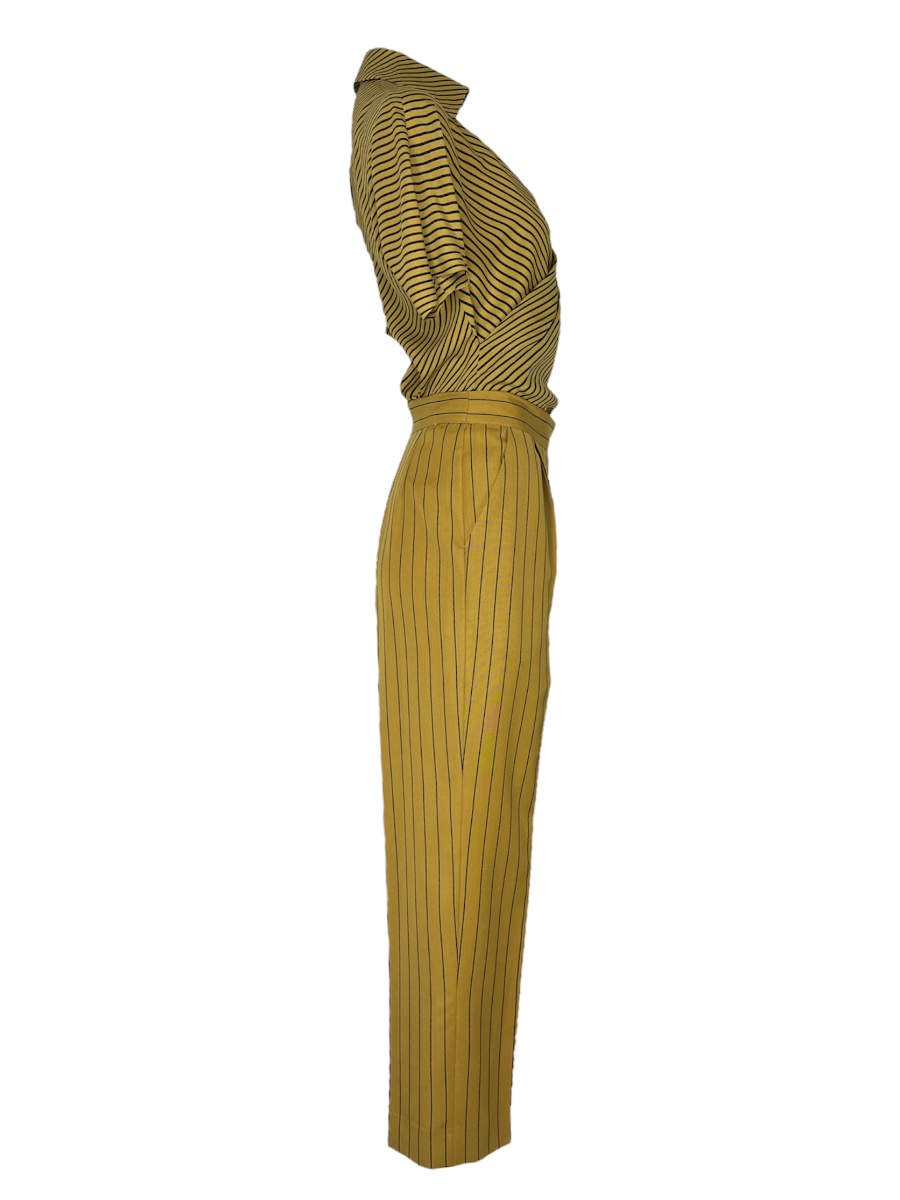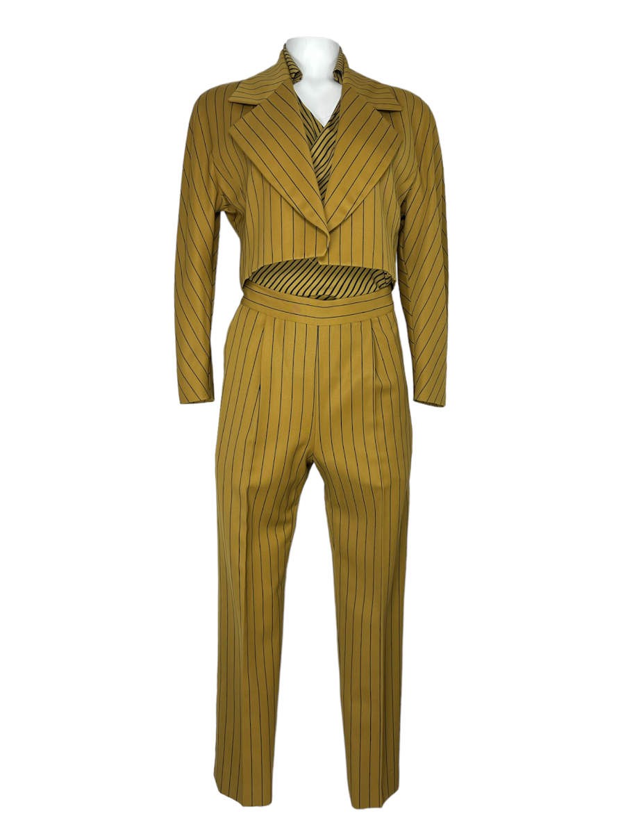 Gianfranco Ferré Ensemble, bestehend aus Hose, Bluse und Blazer besticht besonders durch seine unterschiedlichen schwarzen Streifen auf dem Senfgelben Untergrund.