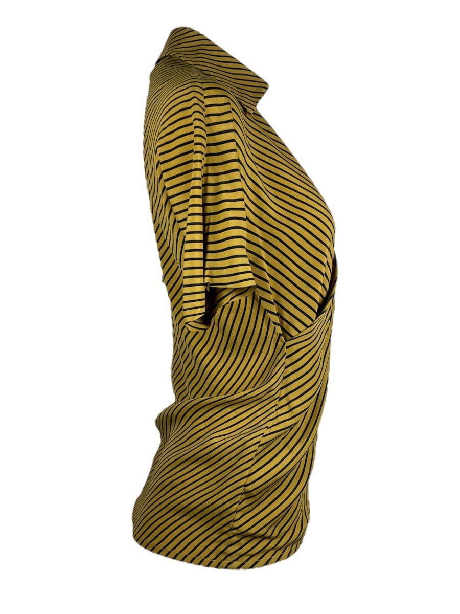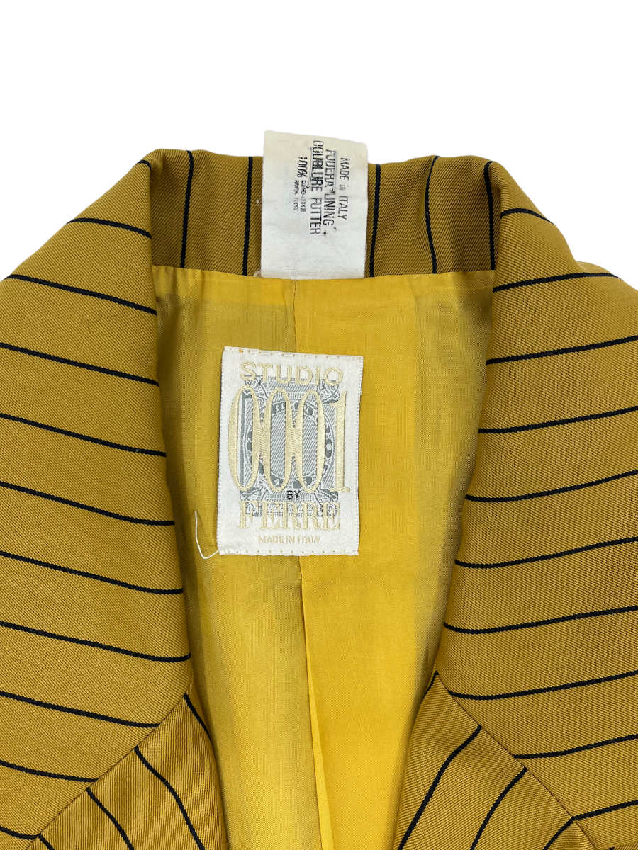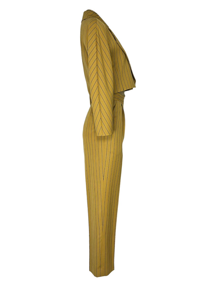 Gianfranco Ferré Ensemble, bestehend aus Hose, Bluse und Blazer besticht besonders durch seine unterschiedlichen schwarzen Streifen auf dem Senfgelben Untergrund.