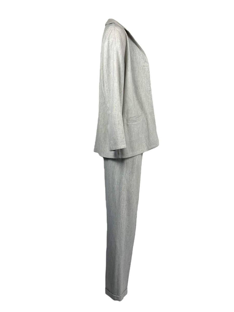 Ein Hosenanzug aus Angora Wolle von Luciana Zuffin in einem hellen Grauton. Das Ensamble ist Weit geschnitten und lässt die Trägerin damit zugleich sportlich und Elegant wirken.