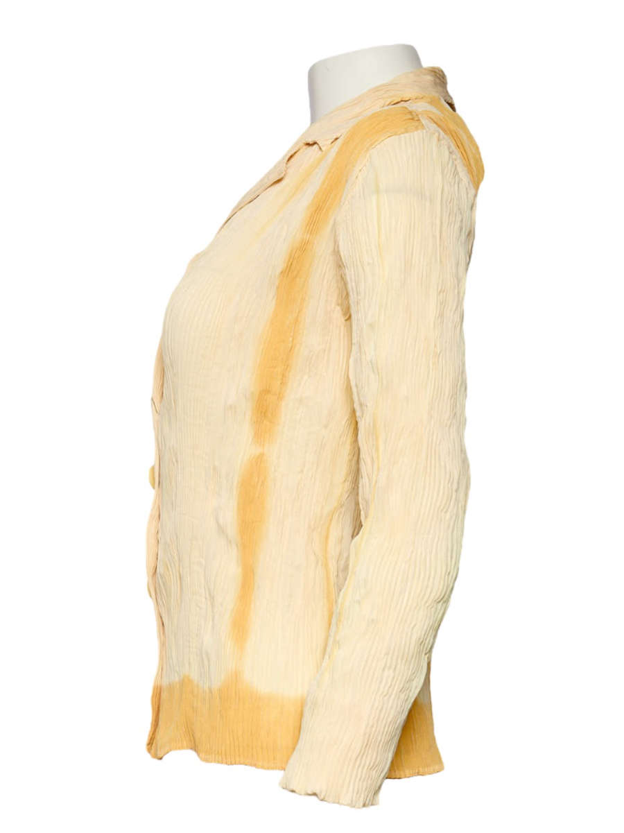 Plissierte Bluse Issey Miyake, beige. Die Bluse hat einen kleinen Reverskragen und eine Knopfleiste vorne. Die Bluse wurde mit „Shibori“ eine spezielle japanische Färbetechnik gefärbt, desshalb hat es auf der Bluse Farbverläufe von Beige zu einem hellen Ocker. Nur Handwäsche. Dieser Artikel ist nur Online erhältlich.