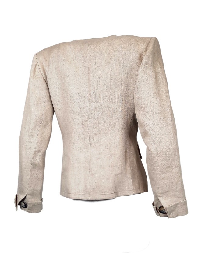 Safari inspirierte Jacke von Saint Laurent in Beige. definierte Silhouette, Tailliert und starke Schultern. Pattentaschen mit grossen knöpfen.