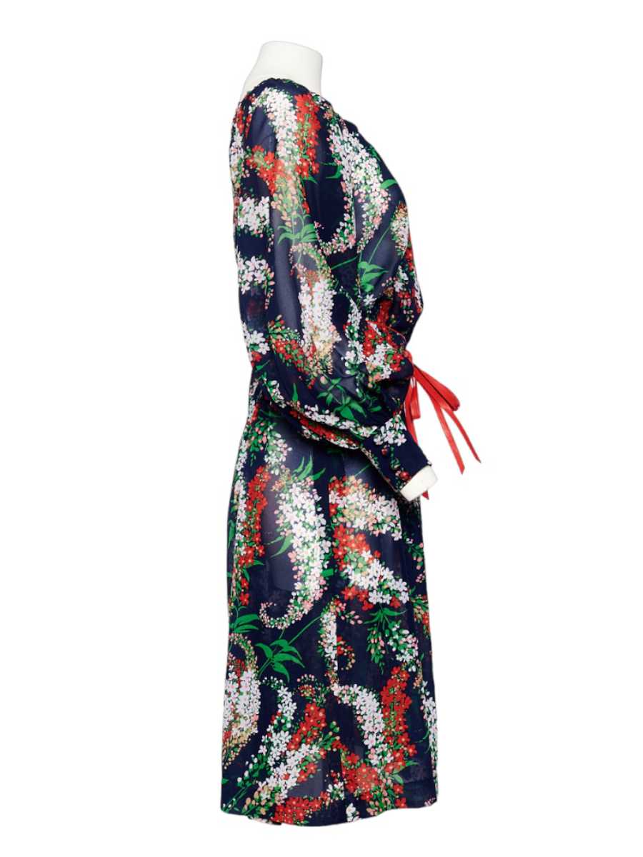 Lässiges Schulterfreies Sommerkleid mit langen Ärmel, Gürtel zum binden mit Lederpassepoile. Puffärmel an der breiten Manschette. Das Kleid wurde aus einem Abraham Stoff gefertigt mit passendem Foulard oder Kopftuch dazu. Dieser Artikel ist nur Online erhältlich.