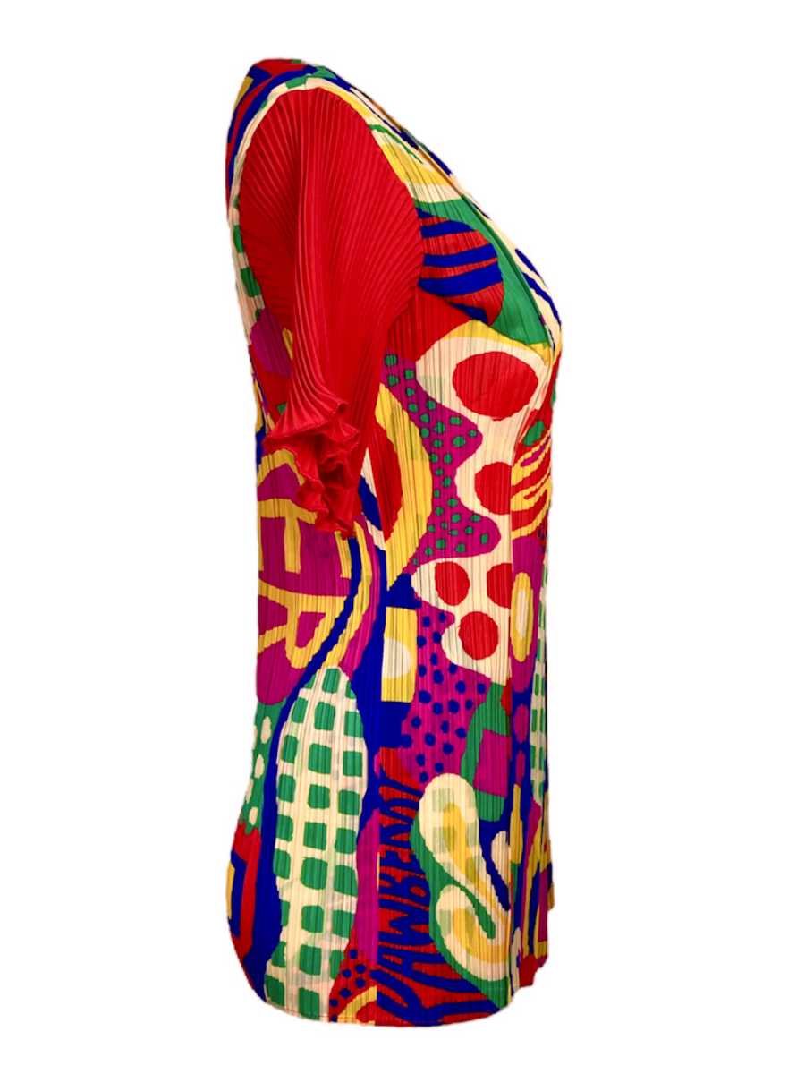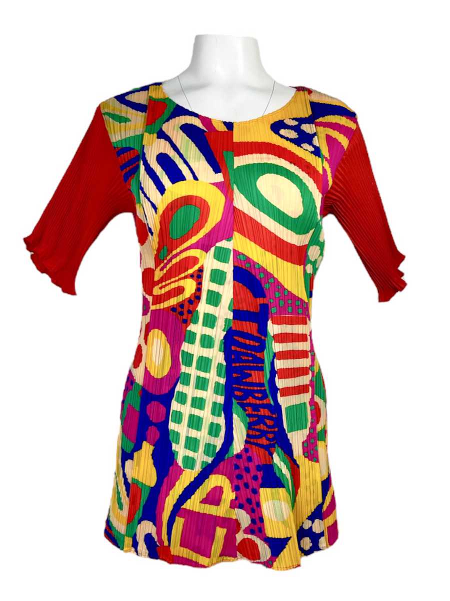Vintage Plissee Oberteil bunt bedruckt. Durch das Plissee ist das Shirt extrem Dehnbar und passt sich verschiedenen Körperformen und -grössen an. Der bunte, geometrische Druck in Kombination mit dem Plissee macht das Oberteil zu einem einzigartigen Stück.