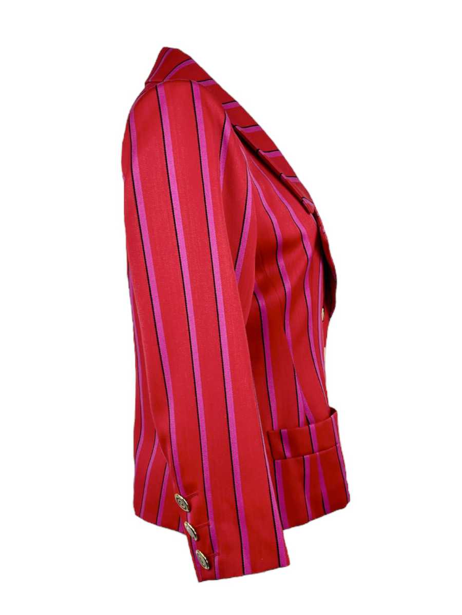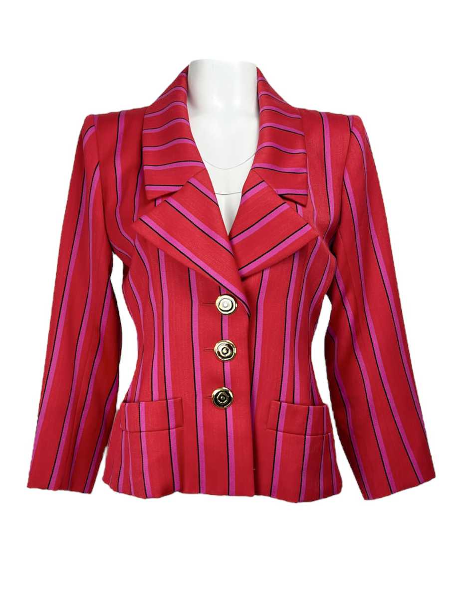 Gestreifter Yves Saint Laurent Blazer, aus einem schön fallenden Wollstoff. Die unregelmässigen Streifen sind in den Farben rot, nachtblau und pink. Der Blazer besitzt einen grossen Reverskragen, goldig, transparente Knöpfe und zwei Leisten Taschen.